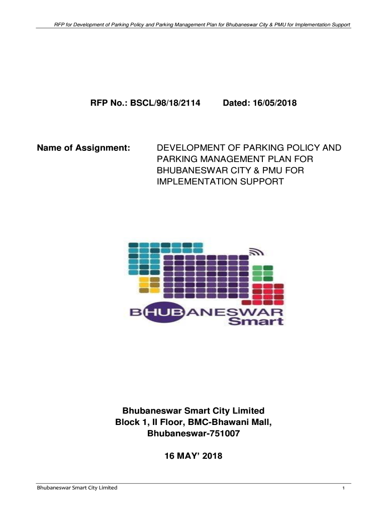 RFP for Development of Parking Policy and Parking Management Plan for Bhubaneswar City & PMU for Implementation Support RFP No.: BCL/98/18/2114Name of Assignment:Dated: 16/05/2018DEVELOPMENT OF PARKING