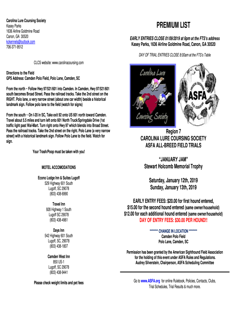 Carolina Lure Coursing Society Kasey Parks 1636 Airline Goldmine Road Canon, GA 30520 kc kennels outlook.com 7063719512PREMIUM LIST EARLY ENTRIES CLOSE 01/09/2019 at 6pm at the Fess address Kasey