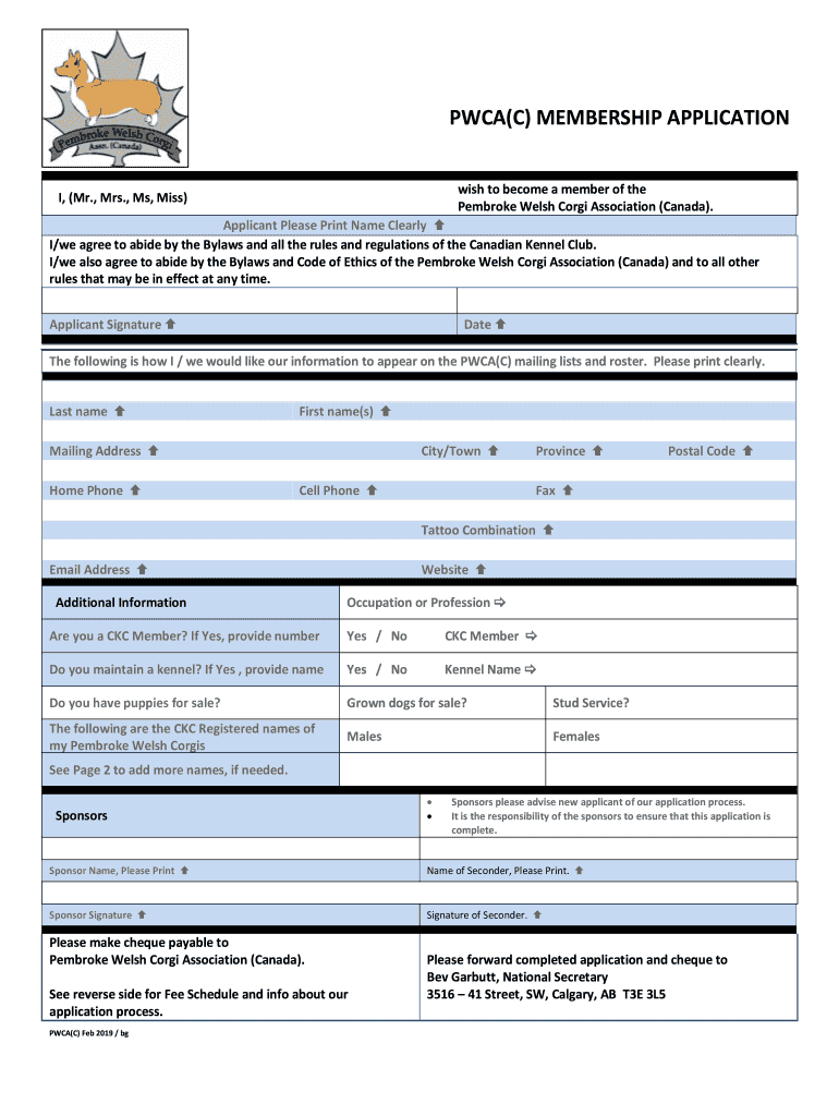 Get the free pwca(c) membership application - Pembroke Welsh Corgi