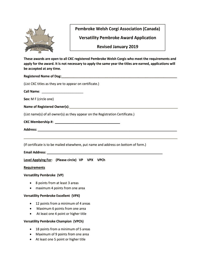 Pembroke Welsh Corgi Association (Canada) Versatility Pembroke Award Application Revised January 2019 These awards are open to all CBC registered Pembroke Welsh Corgis who meet the requirements and