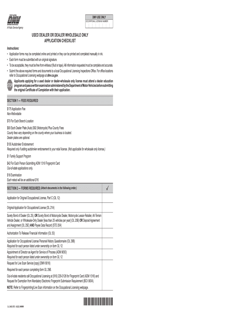 DMV USE NONOCCUPATIONAL LICENSING NUMBER Public Service AgencyUSED DEALER OR DEALER WHOLESALE ONLY APPLICATION CHECKLIST Instructions: Application forms may be completed online and printed, or they