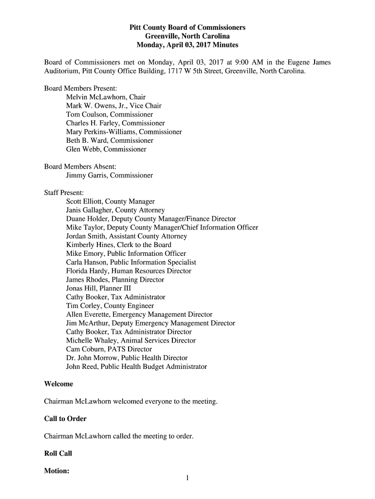 Get the free Board of Commissioners met on Monday, April 03, 2017 at 9:00 AM in the Eugene James