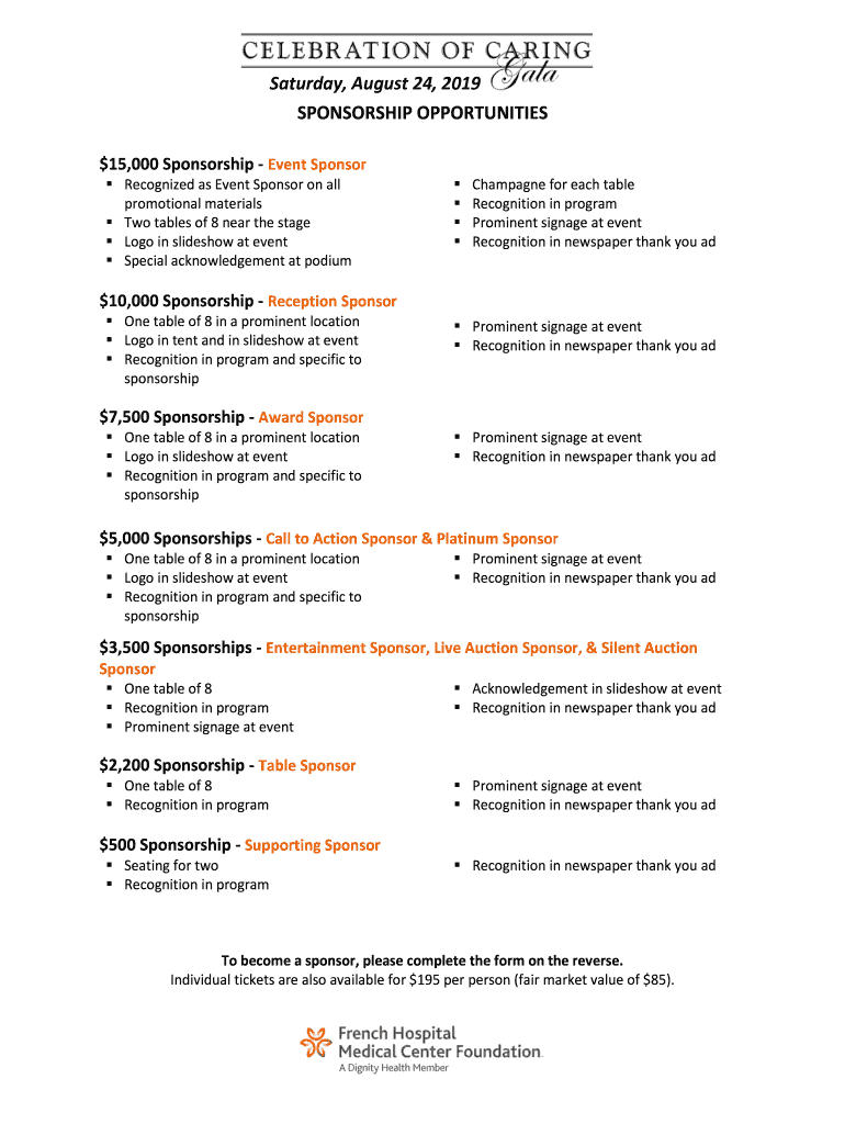 Saturday, August 24, 2019, SPONSORSHIP OPPORTUNITIES $15,000 Sponsorship Event Sponsor Recognized as Event Sponsor on all promotional materials Two tables of 8 near the stage Logo in slideshow at