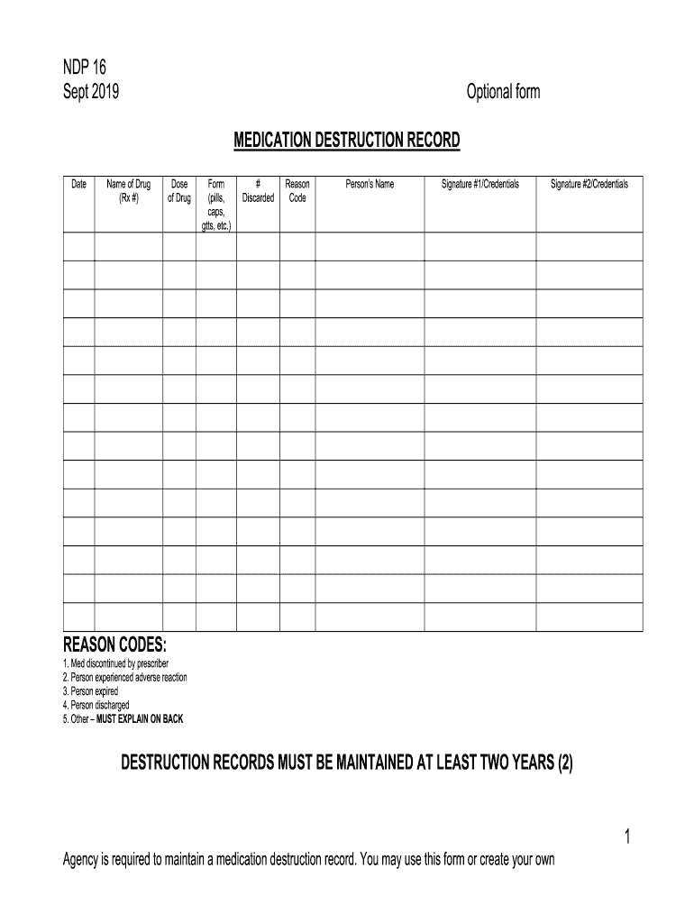NDP 16 Sept 2019Optional form MEDICATION DESTRUCTION RECORDDateName of Drug (Rx #)Dose of Reform (pills, caps, gets, etc.)# DiscardedReason Forepersons NameSignature #1/CredentialsSignature #2/CredentialsREASON