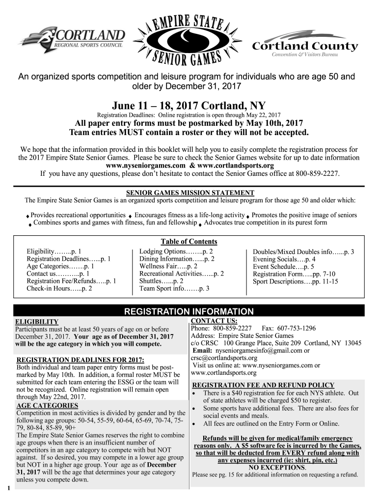 An organized sports competition and leisure program for individuals who are age 50 and older by December 31, 2017June 11 18, 2017 Cortland, Registration Deadlines: Online registration is open through