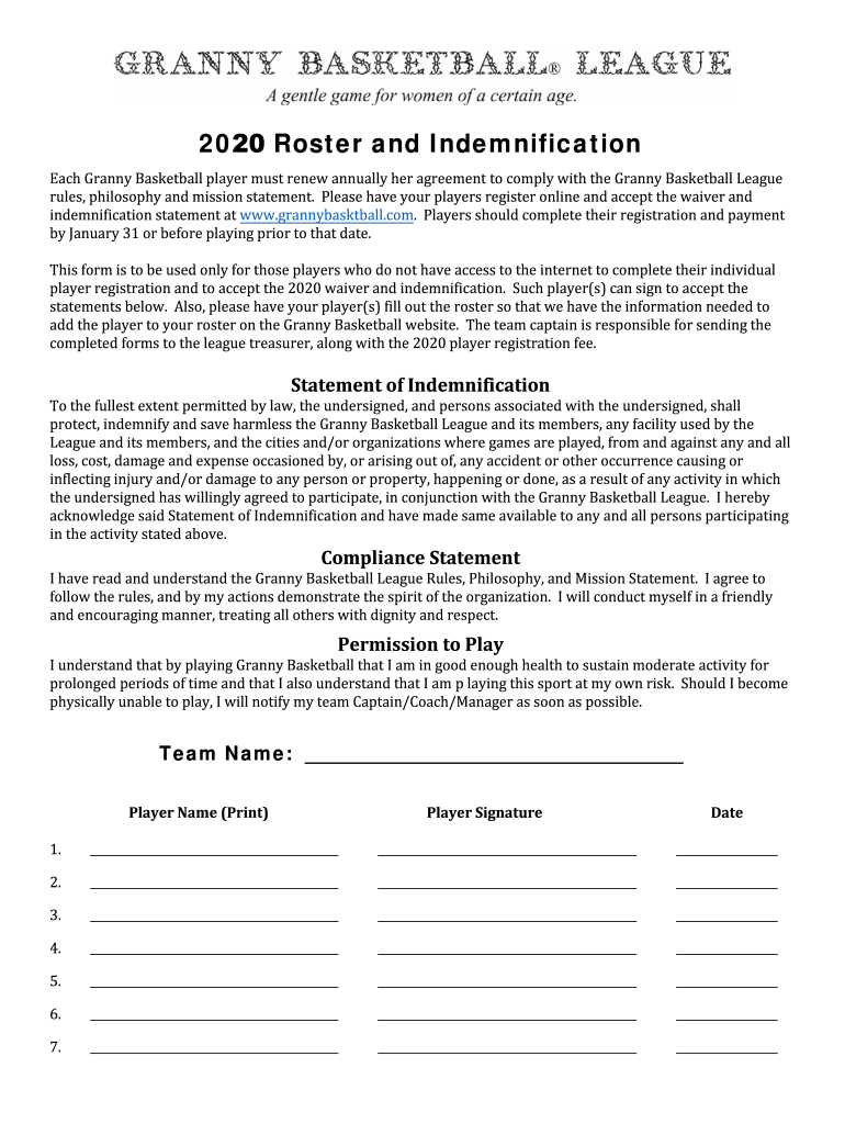 Each Granny Basketball player must renew annually her agreement to comply with the Granny Basketball League rules, philosophy and mission statement. Please have your players register online and accept the waiver and