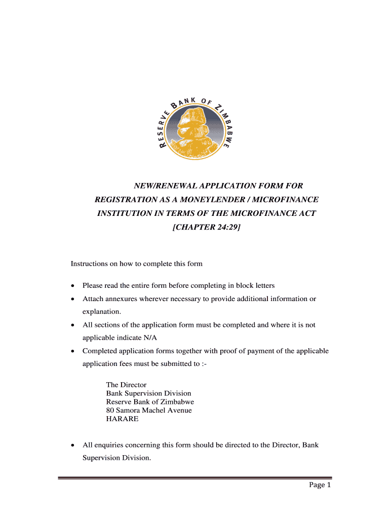 NEW/RENEWAL APPLICATION FORM FOR REGISTRATION AS A MONEYLENDER / MICROFINANCE INSTITUTION IN TERMS OF THE MICROFINANCE ACT CHAPTER 24:29 Instructions on how to complete this form Please read the entire