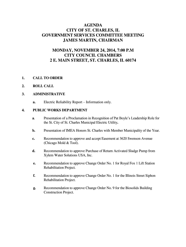 AGENDA CITY OF ST. CHARLES, IL GOVERNMENT SERVICES COMMITTEE MEETING JAMES MARTIN, CHAIRMAN MONDAY, NOVEMBER 24, 2014, 7:00 P. M CITY COUNCIL CHAMBERS 2 E. MAIN STREET, ST. CHARLES, IL 601741.CALL