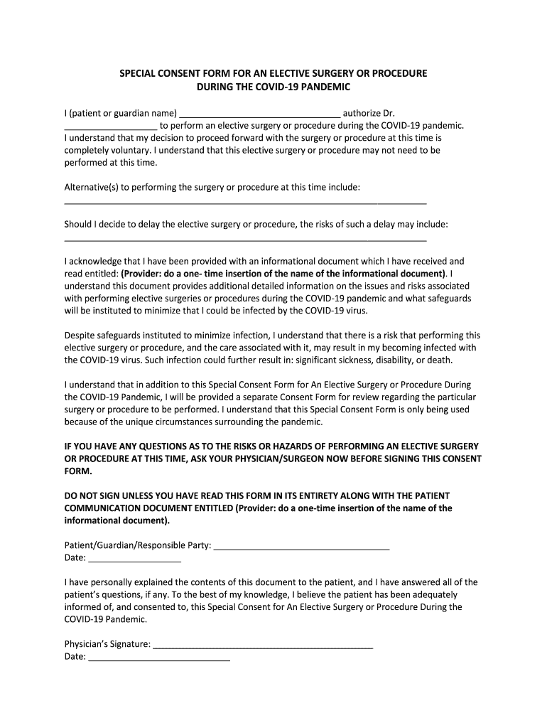 SPECIAL CONSENT FORM FOR AN ELECTIVE SURGERY OR PROCEDURE DURING THE COVID-19 PANDEMIC I (patient or guardian name) authorize Dr. to perform an elective surgery or procedure during the COVID-19 pandemic.