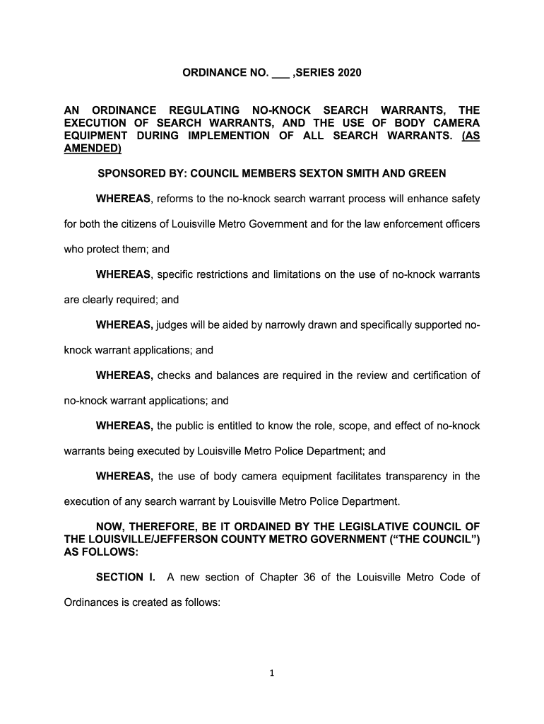 ORDINANCE NO. , SERIES 2020.TITLE AN ORDINANCE REGULATING KNOCK SEARCH WARRANTS, THE EXECUTION OF SEARCH WARRANTS, AND THE USE OF BODY CAMERA EQUIPMENT DURING IMPLEMENTATION OF ALL SEARCH WARRANTS.