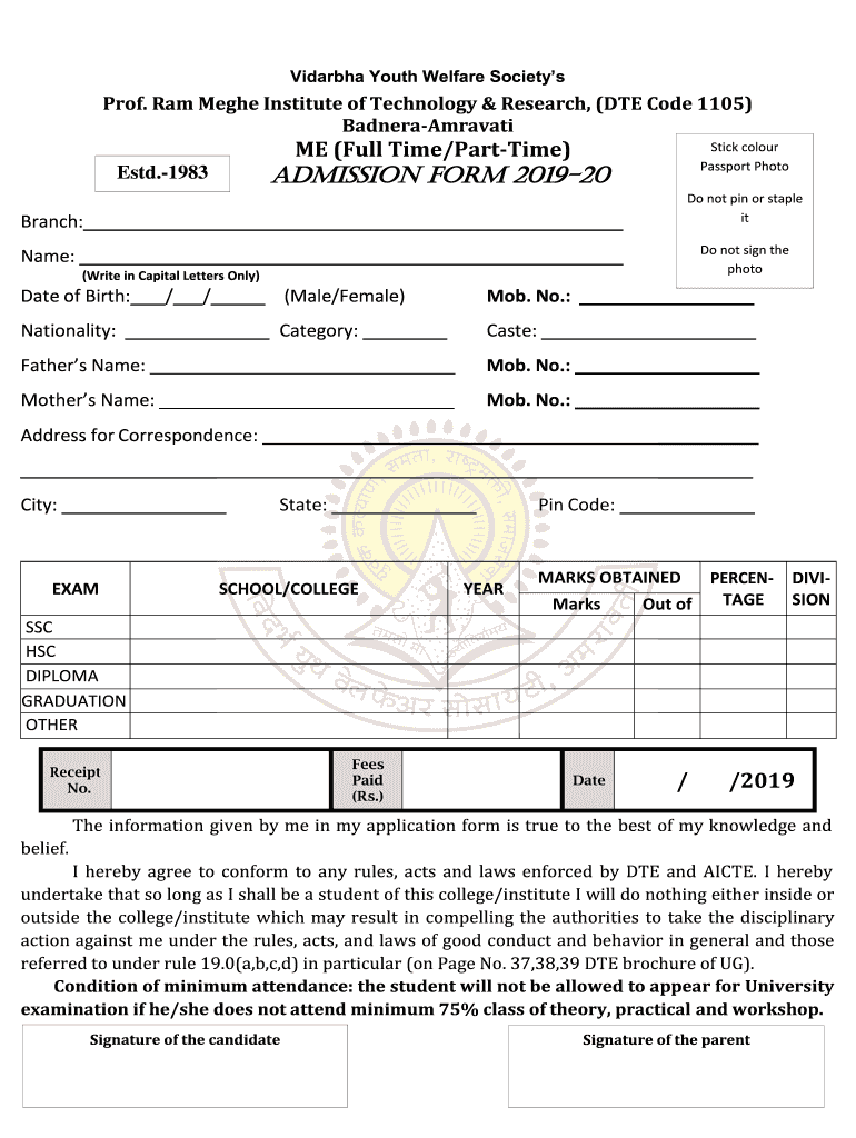 Vivaria Youth Welfare SocietysProf. Ram Meg he Institutes of Technology & Research, (DUE Code 1105) BadneraAmravatiME (Full Time/Maritime)Stick color Passport Photoemission Form 201920Estd.1983Do