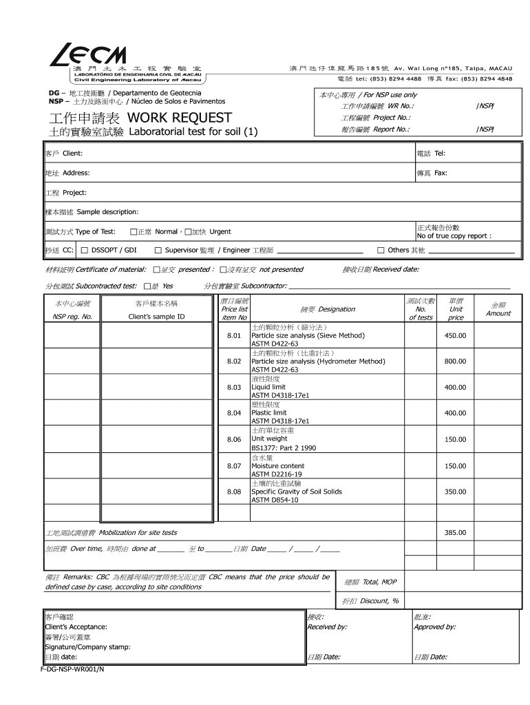 DG / Department de Geotecnia NSW / Cleo de Solos e Pavements / For NSW use only WR No.: WORK REQUEST/NSW/ Project No.: Report No.: Laboratories test for soil (1)/NSW/ Client: Tel: Address: Fax: Project: