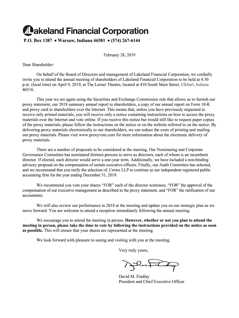 P.O. Box 1387 Warsaw, Indiana 46581 (574) 2676144 February 28, 2019, Dear Shareholder: On behalf of the Board of Directors and management of Lakeland Financial Corporation, we cordially invite you
