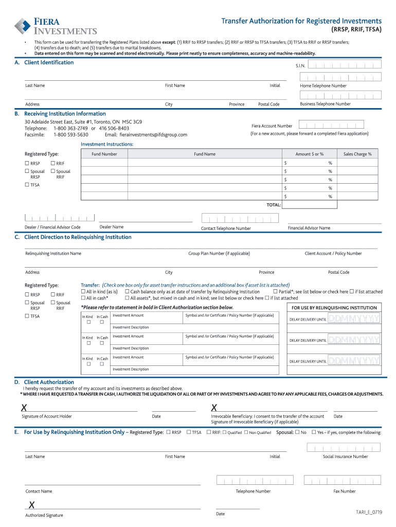 (RESP, RIF, FSA) This form can be used for transferring the Registered Plans listed above except: (1) RIF to RESP transfers; (2) RRI For RESP to FSA