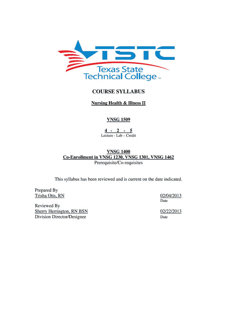 COURSE SYLLABUS Nursing Health & Illness II ENSG 1509 4 2 5 Lecture Lab Credit ENSG 1400 Enrollment in ENSG 1230, ENSG 1301, ENSG 1462 Prerequisite/Corequisites This syllabus has been reviewed and