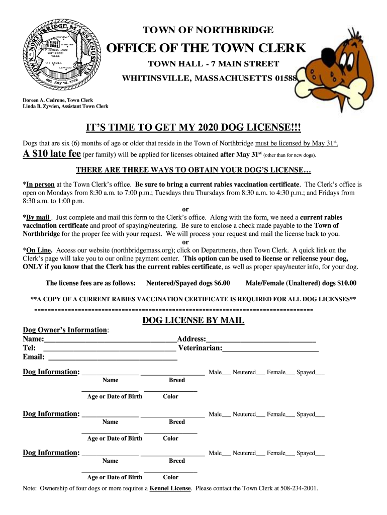 TOWN OF NORTHBRIDGEOFFICE OF THE TOWN CLERK TOWN HALL 7 MAIN STREET MARTINSVILLE, MASSACHUSETTS 01588 Doreen A. Ce drone, Town Clerk Linda B. Gawain, Assistant Town Clerk It's TIME TO GET MY 2020
