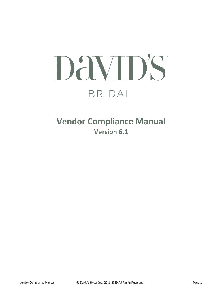 Version 6.1Vendor Compliance Manual David\'s Bridal Inc. 20112019 All Rights Reserved Page 1Introduction