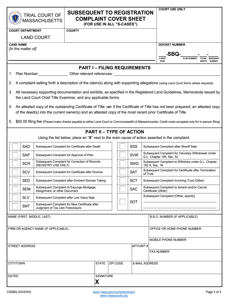 After REGISTRATION TRIAL COURT OF COMPLAINT COVER SHEET MASSACHUSETTSCOURT USE NUCLEAR(FOR USE IN ALL CASES)COURT DEPARTMENTPRINTCOUNTYLAND COURT CASE NAMEDOCKET NUMBER In the matter of BBQ 2DIGIT