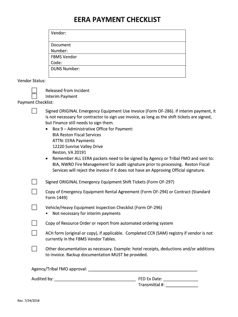 ERA PAYMENT CHECKLIST Vendor: Document Number: FBS Vendor Code: DUNS Number: Vendor Status: Released from Incident Interim Payment Checklist: Signed ORIGINAL Emergency Equipment Use Invoice (Form