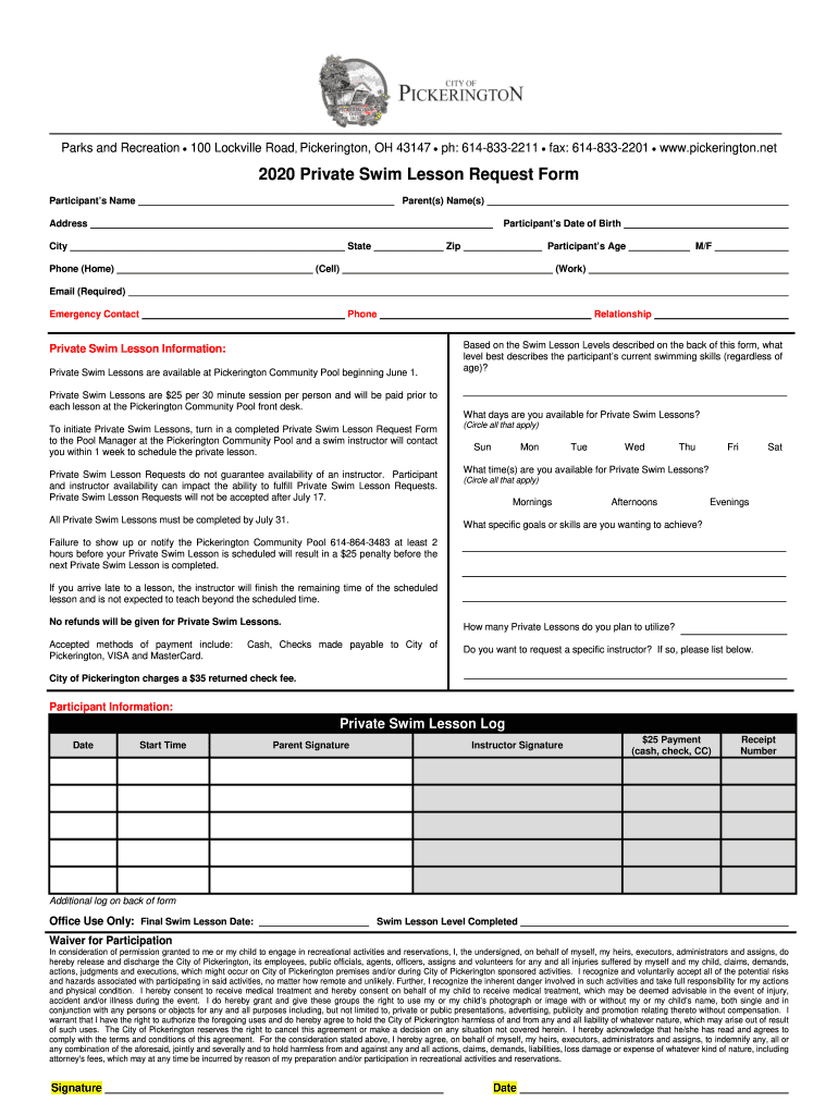 Parks and Recreation 100 Rockville Road, Pickering ton, OH 43147 pH: 6148332211 fax: 6148332201 www.pickerington.net2020 Private Swim Lesson Request Form Participants Apparent(s) Name(s)AddressParticipants