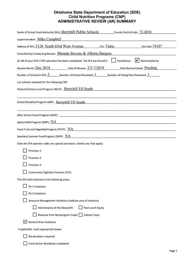 Oklahoma State Department of Education (SDE) Child Nutrition Programs (CNP) ADMINISTRATIVE REVIEW (AR) SUMMARY Name of School Food Authority (SFA): Berry hill Superintendent:Public SchoolsCounty District