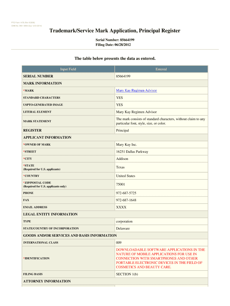OMB No. 06510009 (Exp 12/31/2014)Trademark/Service Mark Application, Principal Register
