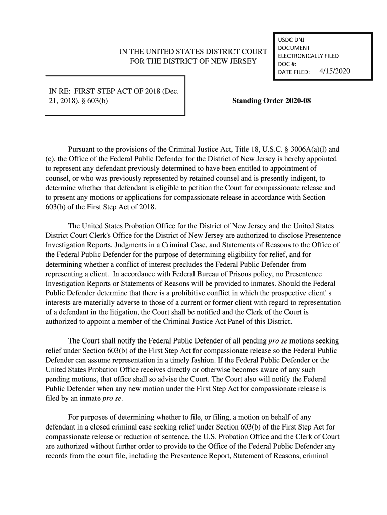 IN THE UNITED STATES DISTRICT COURT FOR THE DISTRICT OF NEW JERSEY IN RE: FIRST STEP ACT OF 2018 (Dec. 21, 2018), 603(b)USDA DNS DOCUMENT ELECTRONICALLY FILED DOC #: 4/15/2020 DATE FILED: Standing