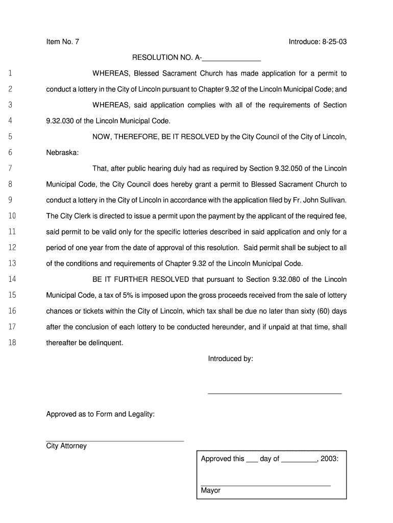 Item No. 7Introduce: 82503 RESOLUTION NO. A 1WHEREAS, Blessed Sacrament Church has made application for a permit to2conduct a lottery in the City of Lincoln pursuant to Chapter 9.32 of the Lincoln