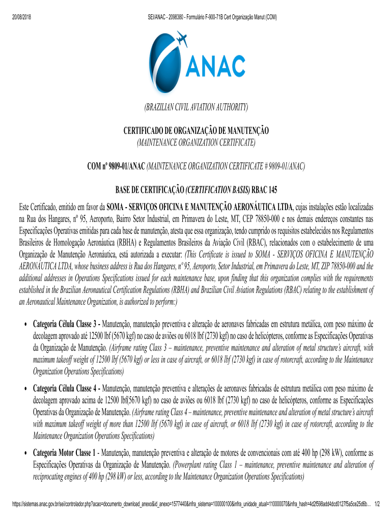 20/08/2018SEI/ANA 2098380 Formulaic F90071B Cert Organized Manet (COM)(BRAZILIAN CIVIL AVIATION AUTHORITY) CERTIFICATE DE ORGANIZED DE MINUTES (MAINTENANCE ORGANIZATION CERTIFICATE) COM n 980901/ANA