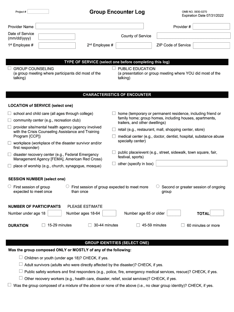 Group Encounter Project #Provider Name Date of Service (mm/dd/YYY)1st Employee #OMB NO. 09300270Expiration Date 07/31/2022 Provider #County of Service2nd Employee #ZIP Code of Serviceable OF SERVICE