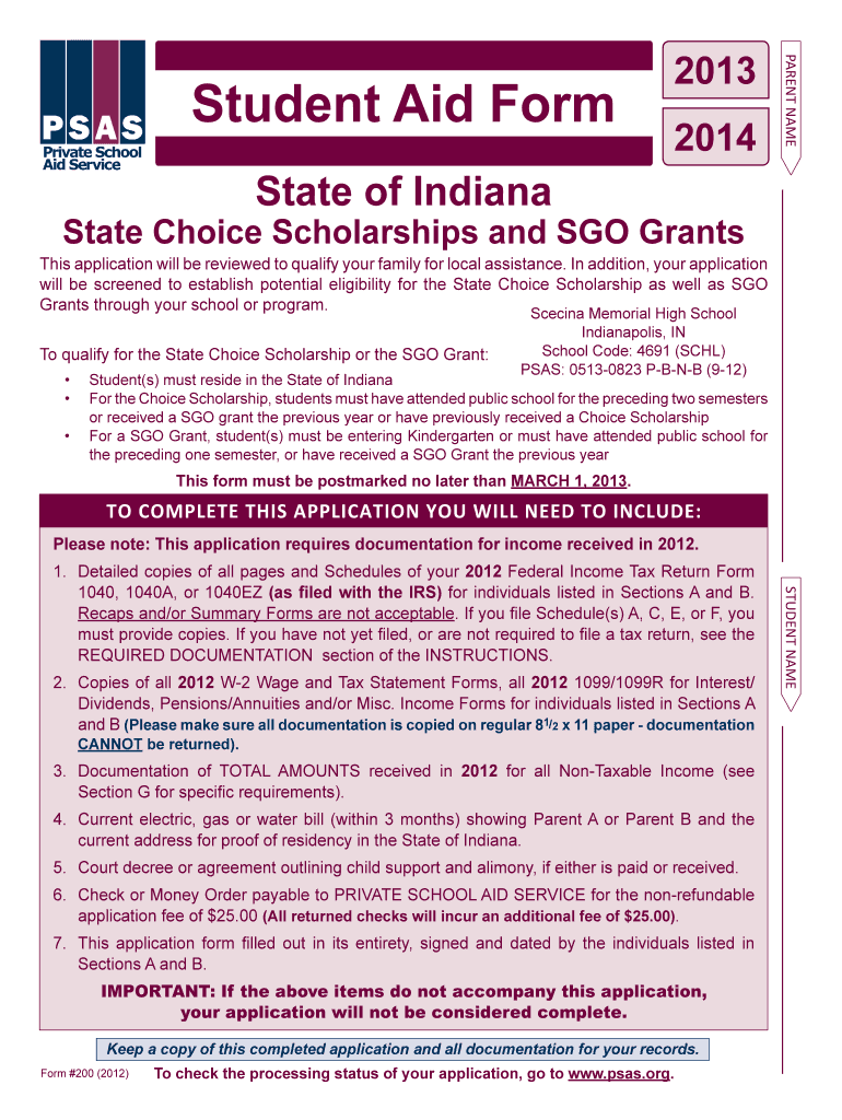 The Indiana Student Aid Form is a financial aid application used by families in Indiana to apply for local assistance, State Choice Scholarships, and SGO Grants for tuition-charging schools.