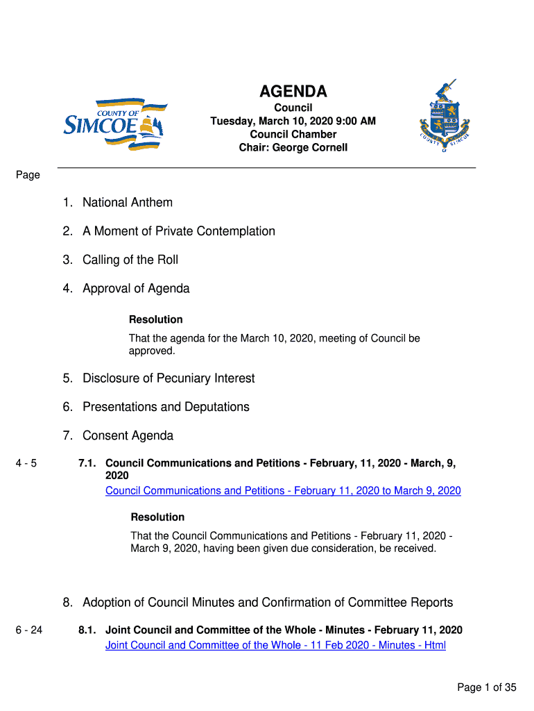 AGENDA Council Tuesday, March 10, 2020 9:00 AM Council Chamber Chair: George Cornell Page1. National Anthem 2. A Moment of Private Contemplation 3. Calling of the Roll 4. Approval of Agenda Resolution