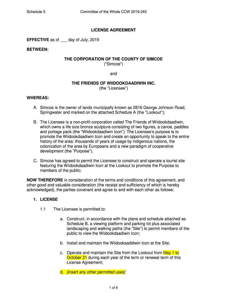 Schedule 5Committee of the Whole CCW 2019245LICENSE AGREEMENT EFFECTIVE as of day of July 2019 BETWEEN: THE CORPORATION OF THE COUNTY OF SIM COE (“Since “) and THE FRIENDS OF WIIDOOKDAADIWIN INC.
