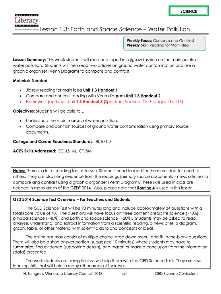 SCIENCELesson 1.3: Earth and Space Science Water Pollution Weekly Focus: Compare and Contrast Weekly Skill: Reading for Main IdeaLesson Summary: This week students will read and report in a jigsaw