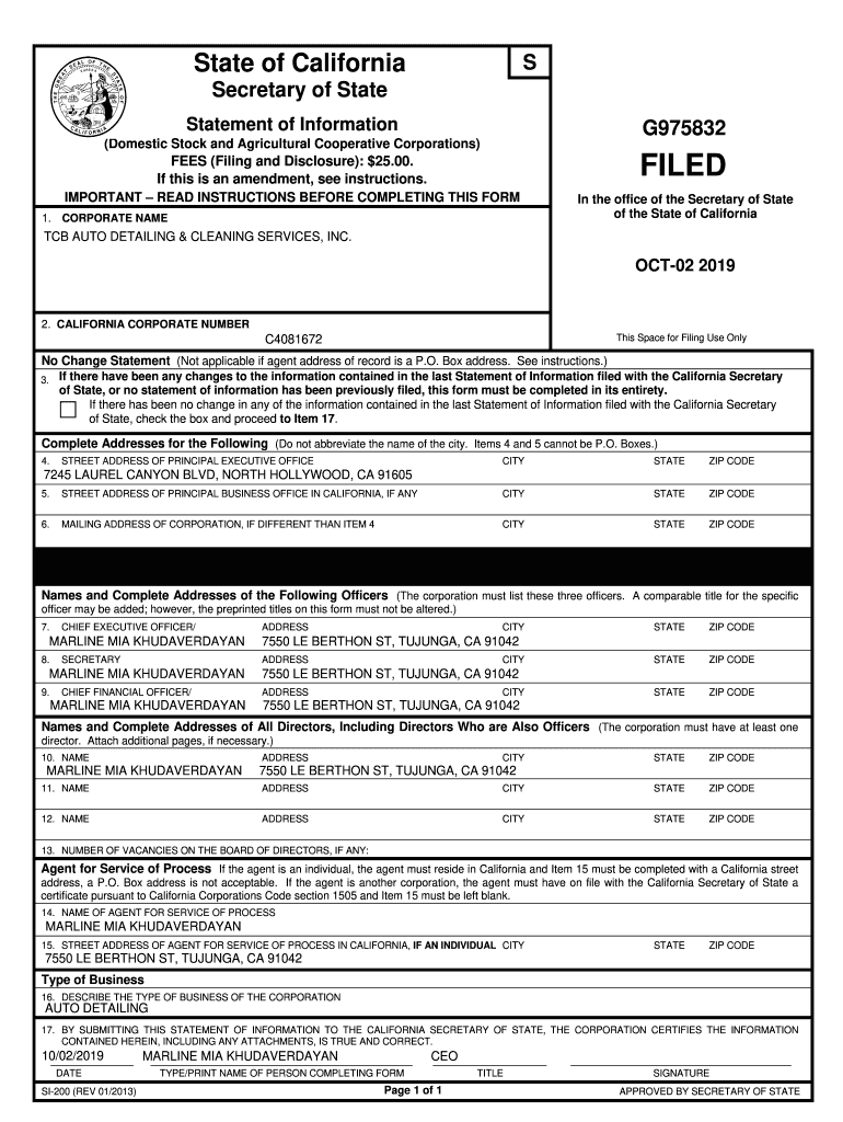 Get the free Filing For TCB AUTO DETAILING & CLEANING SERVICES, INC.. Statement of Inform...