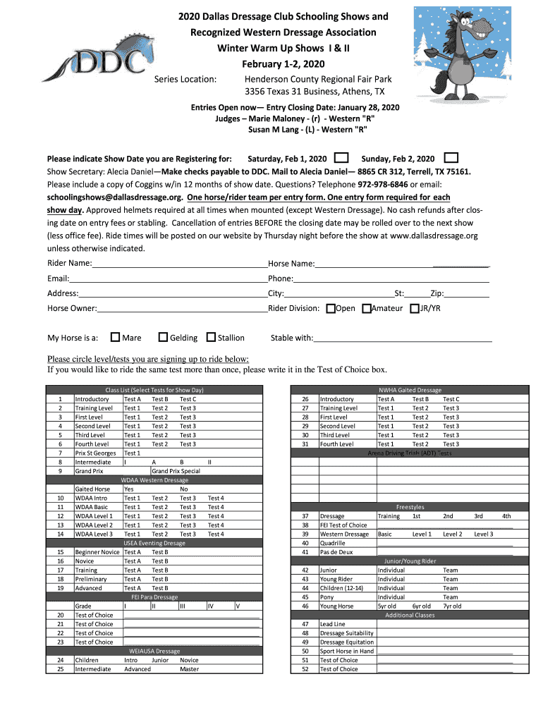 2020 Dallas Dressage Club Schooling Shows and Recognized Western Dressage Association Winter Warm Up Shows I & II February 12, 2020, Series Location:Henderson County Regional Fair Park 3356 Texas