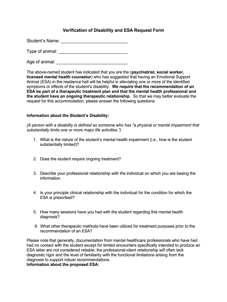 Verification of Disability and ESA Request Form Students Name: Type of animal: Age of animal: The above named student has indicated that you are the (psychiatrist, social worker, licensed mental health