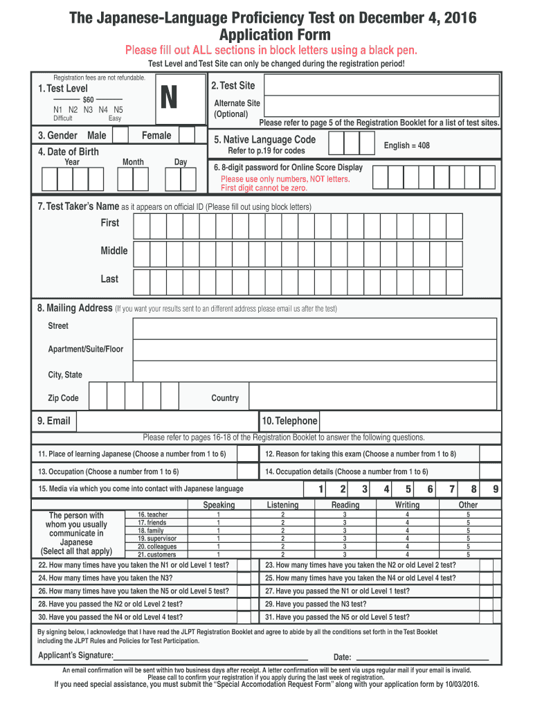 The JapaneseLanguage Proficiency Test on December 4, 2016, Application Form Please fill out ALL sections in block letters using a black pen. Test Level and Test Site can only be changed during the
