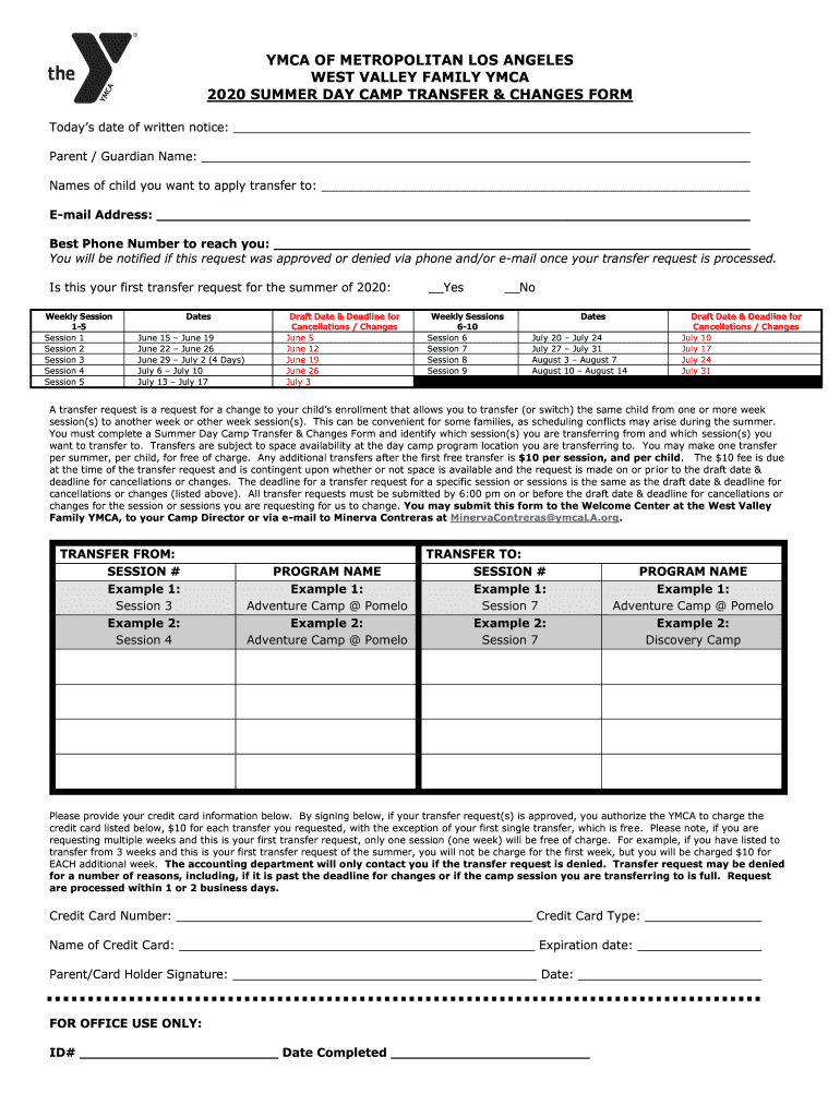 YMCA OF METROPOLITAN LOS ANGELES WEST VALLEY FAMILY YMCA 2020 SUMMER DAY CAMP TRANSFER & CHANGES FORM Today's date of written notice: Parent / Guardian Name: Names of child you want to apply transfer