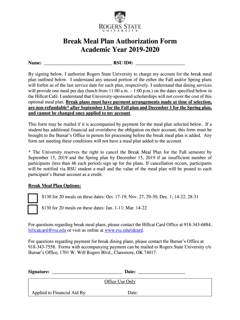 Break Meal Plan Authorization Form Academic Year 20192020 Name: RSU ID#: By signing below, I authorize Rogers State University to charge my account for the break meal plan outlined below. I understand