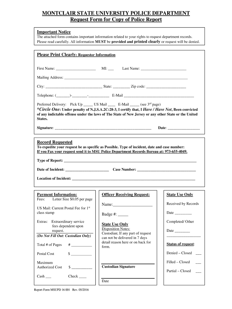 MONTCLAIR STATE UNIVERSITY POLICE DEPARTMENT Request Form for Copy of Police Report Important Notice The attached form contains important information related to your rights to request department records.