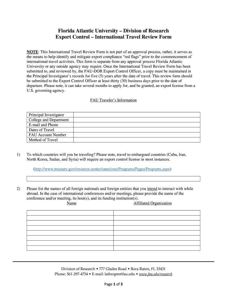 Florida Atlantic University Division of Research Export Control International Travel Review Form NOTE: This International Travel Review Form is not part of an approval process, rather, it serves as