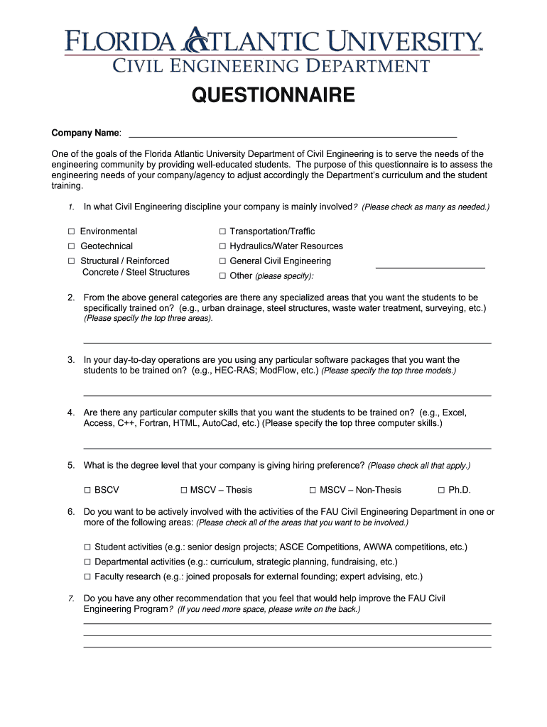 QUESTIONNAIRE Company Name: One of the goals of the Florida Atlantic University Department of Civil Engineering is to serve the needs of the engineering community by providing well-educated students.