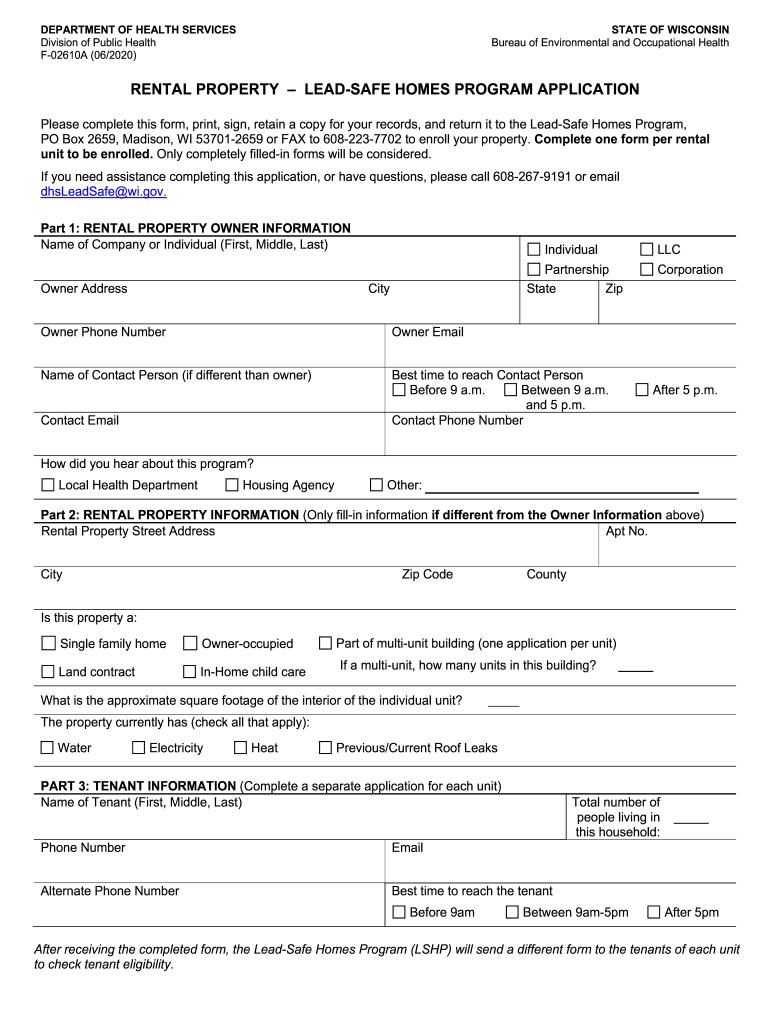 DEPARTMENT OF HEALTH SERVICES Division of Public Health F02610A (06/2020)STATE OF WISCONSIN Bureau of Environmental and Occupational HealthRENTAL PROPERTY LEADS AFE HOMES PROGRAM APPLICATION Please