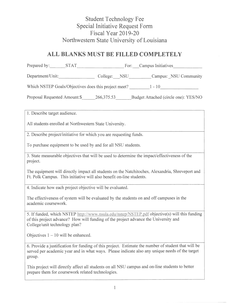 Student Technology Fee Special Initiative Request Form Fiscal Year 201920 Northwestern State University of Louisiana ALL BLANKS MUST BE FILLED COMPLETELY Prepared by: STAT Department/Unit: For: Campus