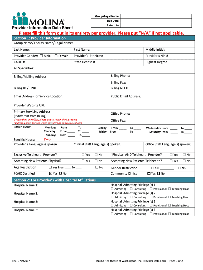 Group/Legal Name Due Date Return provider Information Data SheetPlease fill this form out in its entirety per provider; Please put N/! If not applicable; Section 1: Provider Information Group Name/