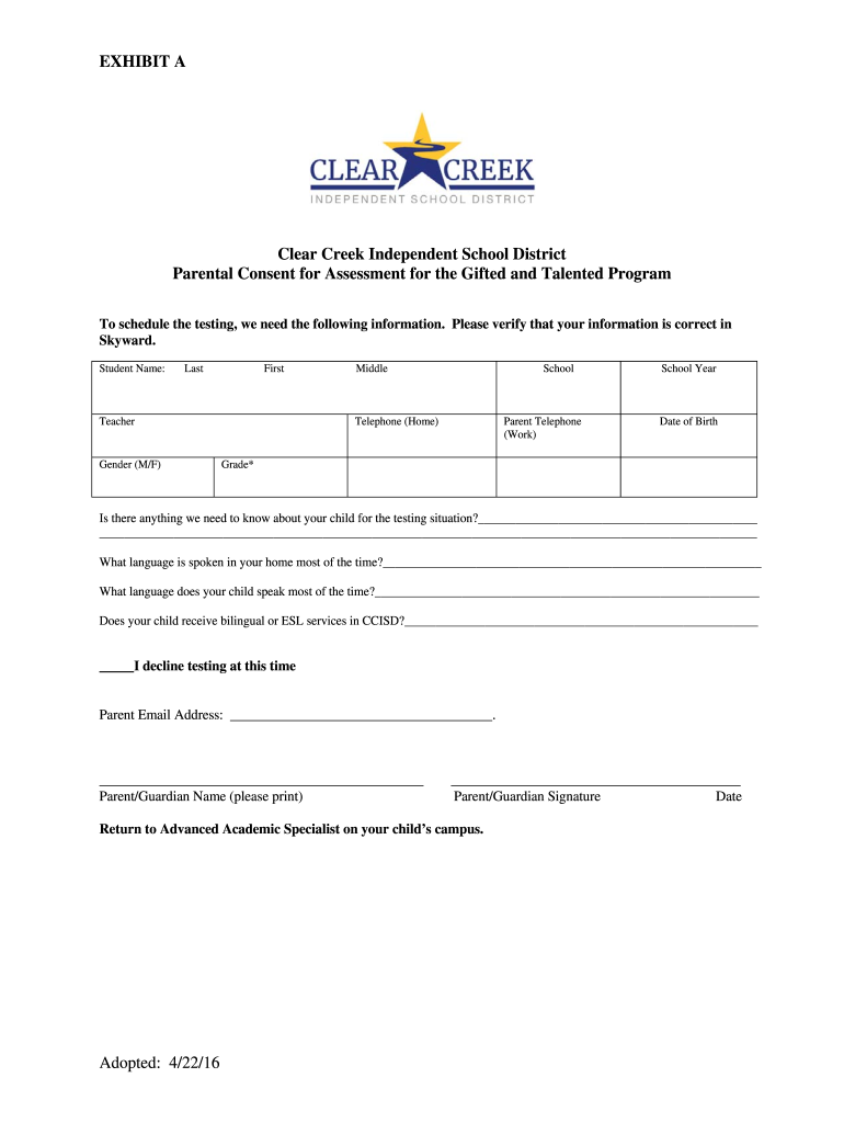 EXHIBIT Clear Creek Independent School District Parental Consent for Assessment for the Gifted and Talented Program To schedule the testing, we need the following information. Please verify that your