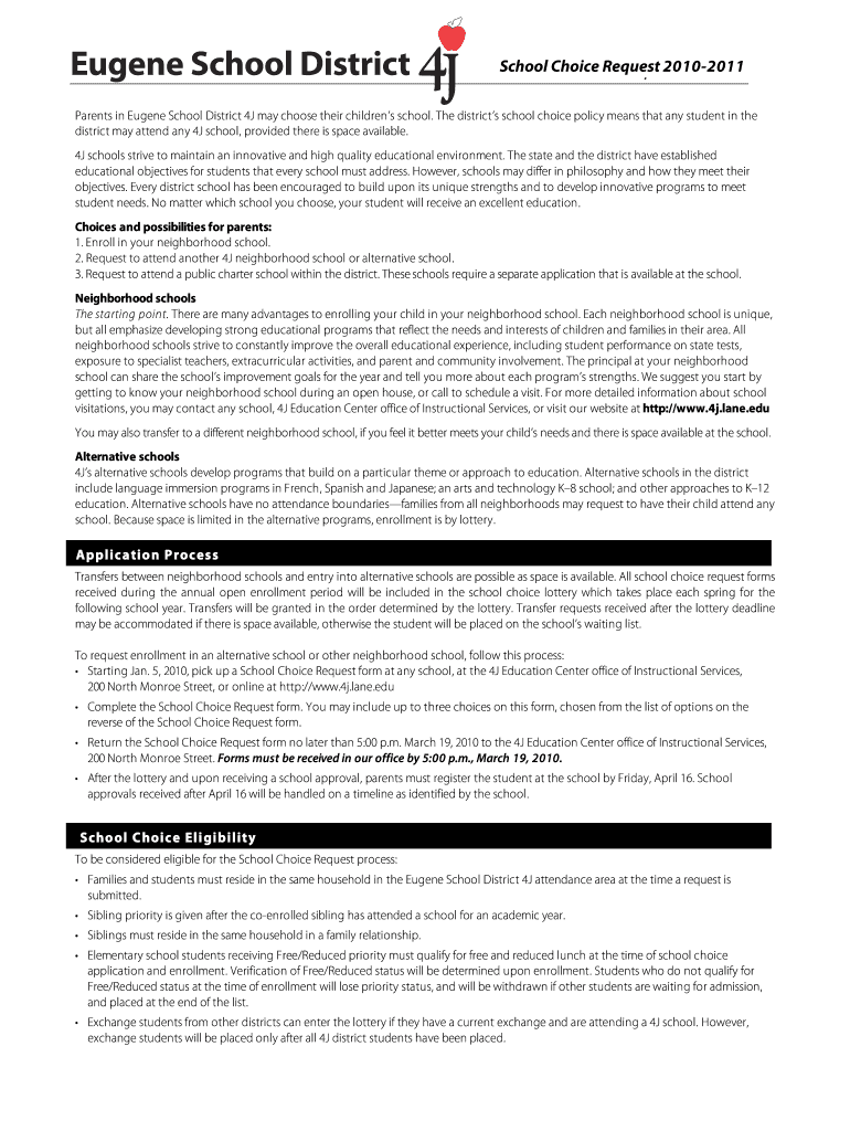The School Choice Request Form must be submitted by a specific deadline set by the Eugene School District 4J. Be sure to check the district's website for the exact date each enrollment period.