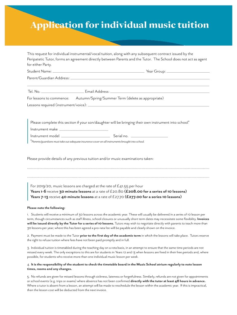 Application for individual music tuition This request for individual instrumental/vocal tuition, along with any subsequent contract issued by the Peripatetic Tutor, forms an agreement directly between