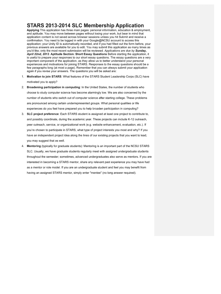 STARS 20132014 SLC Membership Application Applying This application has three main pages: personal information, education & employment, and aptitude. You may move between pages without losing your